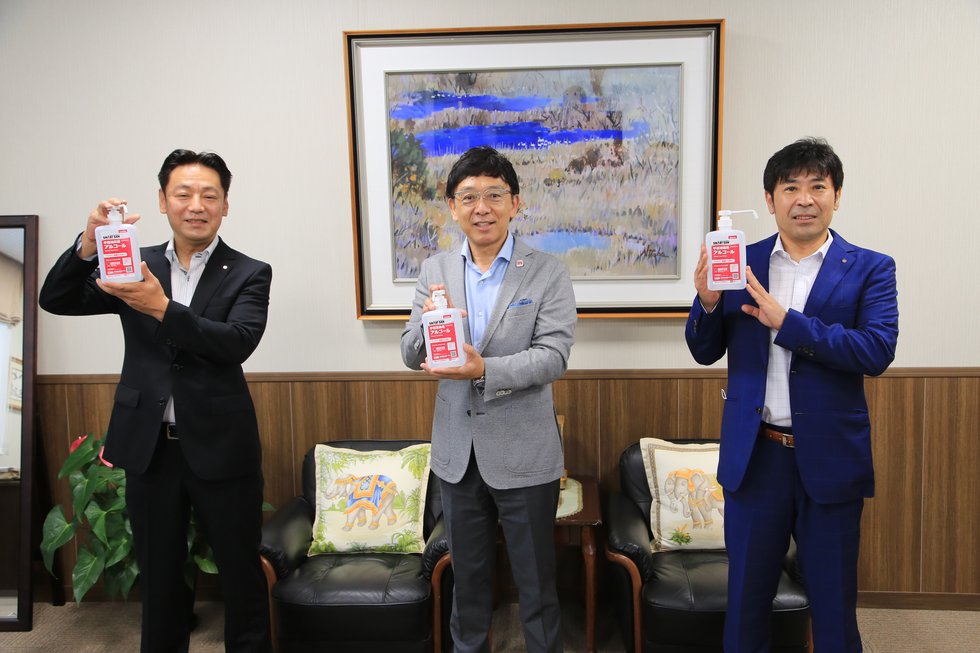 7月10日に豊前ロータリークラブ会長の武吉竜盟さん(吉富町土屋区:事務用品販売業経営)と前会長の林孝俊さん(吉富町和井田区:自動車整備工場経営)が訪れ、手指用の消毒液(18リットル×4本)とプッシュポンプ式容器を小・中学校で使ってほしいと町に寄贈していただきました。